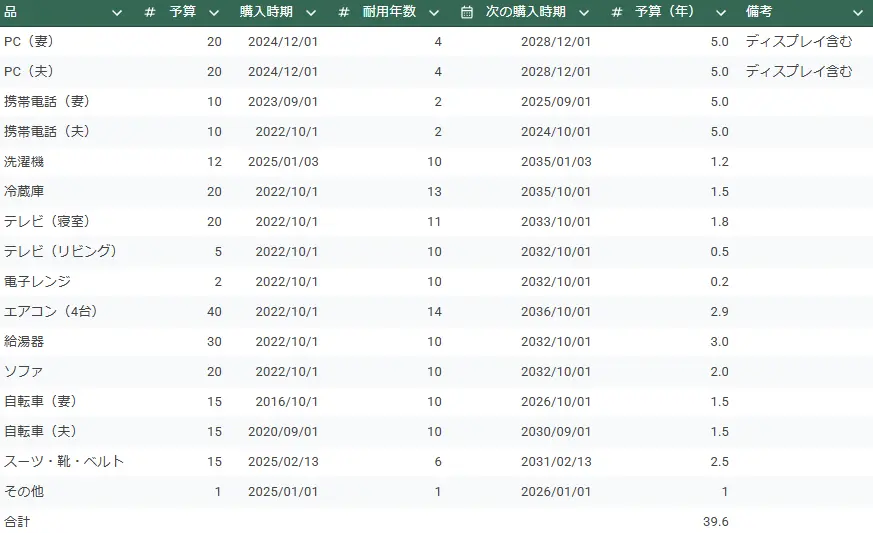 次にリストアップしたものの予算や耐用年数を確認していきましょう。